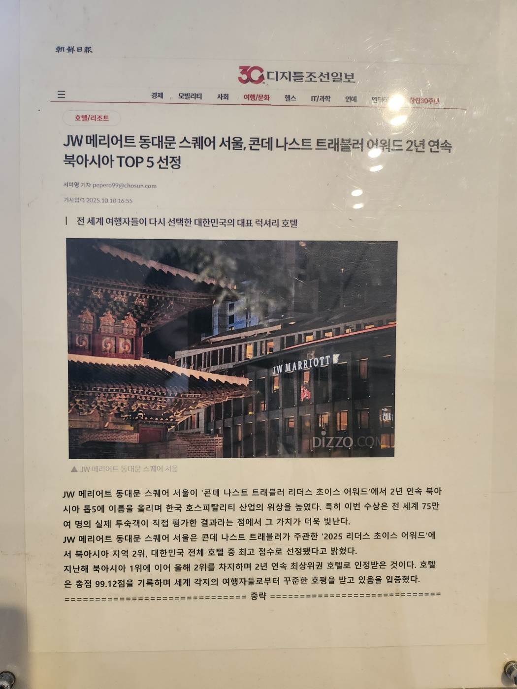최근 동대문 메리어트 호텔이 2024–2025년 글로벌 호텔 평가에서 서비스·다이닝 부문 우수상을 수상했다는 소식 들으셨나요?